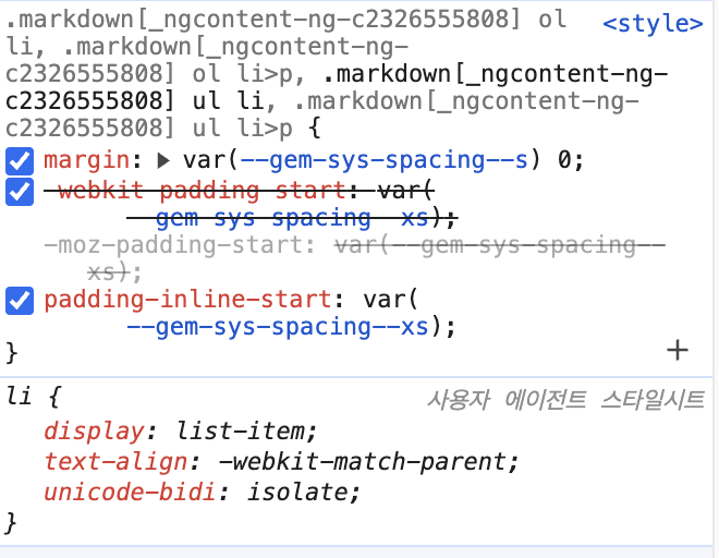 브라우저의 개발자 도구(F12 또는 마우스 우클릭 > 검사)를 열어 특정 요소에 적용된 스타일의 출처를 확인 할 수 있다. *사용자 에이전트 스타일시트*