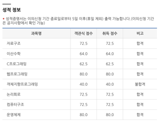 - 모든 과목 신청하기 : 일부 과목만 응시할 필요한 경우가 아니라면, 가급적 모든 과목에 응시하는 것을 권장한다. 기본적인 지식만으로 합격하는 과목이 생길 수 있다. 나도 별도로 학습하지 않은 웹 프로그래밍에 합격했고, 학습량이 적었던 이산수학도 합격했다.