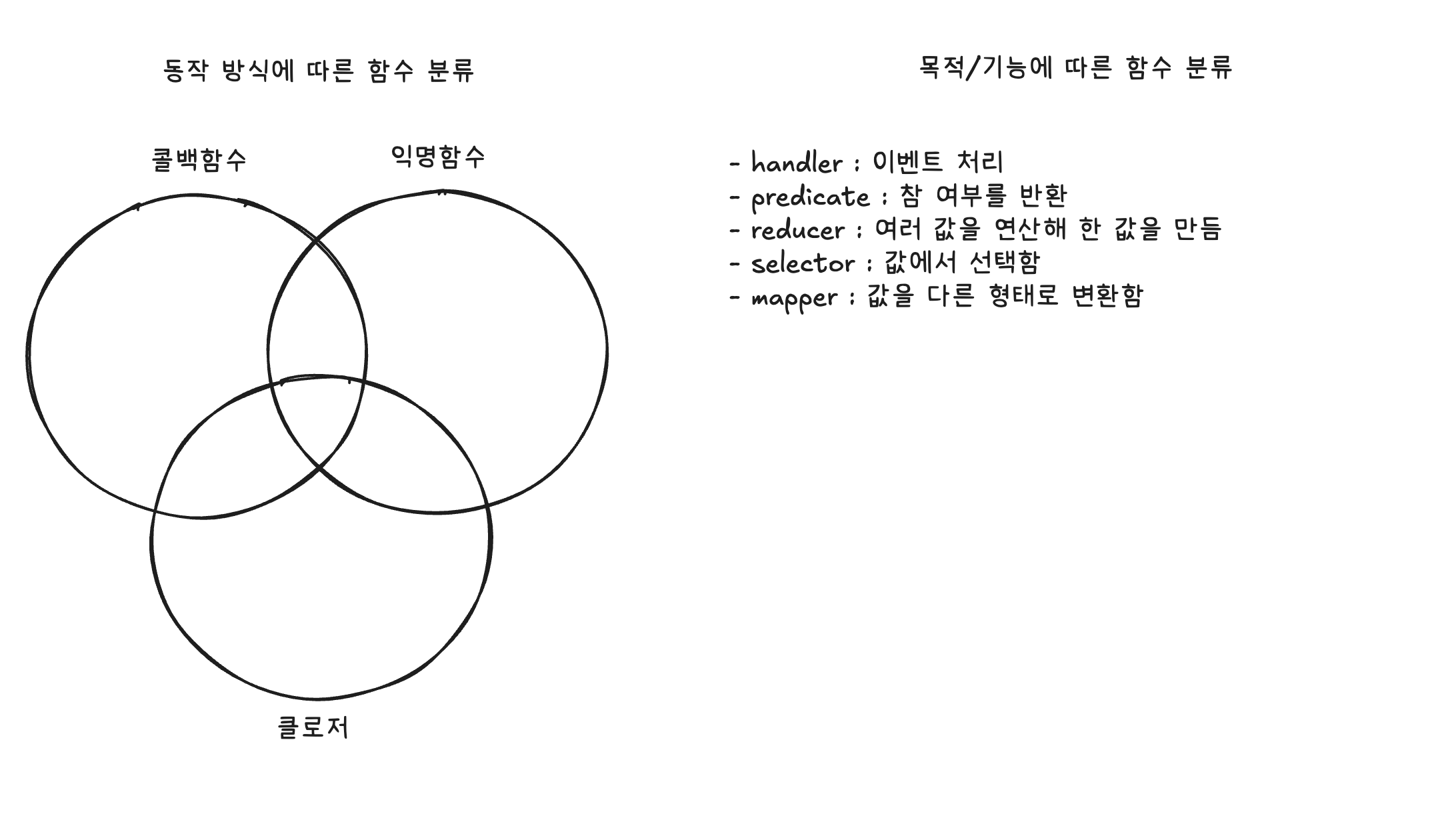 함수들의 용도(기능)에 아래와 같이 분류할 수 도 있다. 다만 이러한 분류는 기능에 따른 분류고, 콜백함수는 사용방법에 따른 분류이기 때문에 아래 함수들이 꼭 콜백 함수일 필요는 없다.