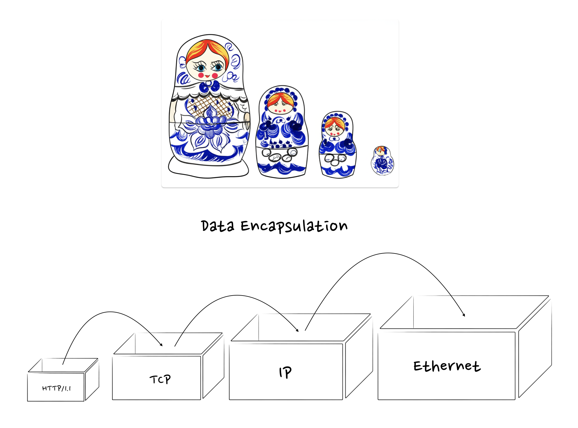 웹 브라우저같은 애플리케이션에서 데이터를 보내면, 데이터는 각 계층을 내려가면서 마치 러시아 인형 마트료시카처럼 포장된다. 각 계층은 자신의 역할에 필요한 제어 정보(주소, 순서, 오류 검증 등)를 데이터 앞부분에 추가하는데, 이를 헤더(Header)라고 한다. 이렇게 데이터가 하위 계층으로 넘겨지며 헤더가 붙여지는 과정을 캡슐화(Encapsulation)라고 한다.