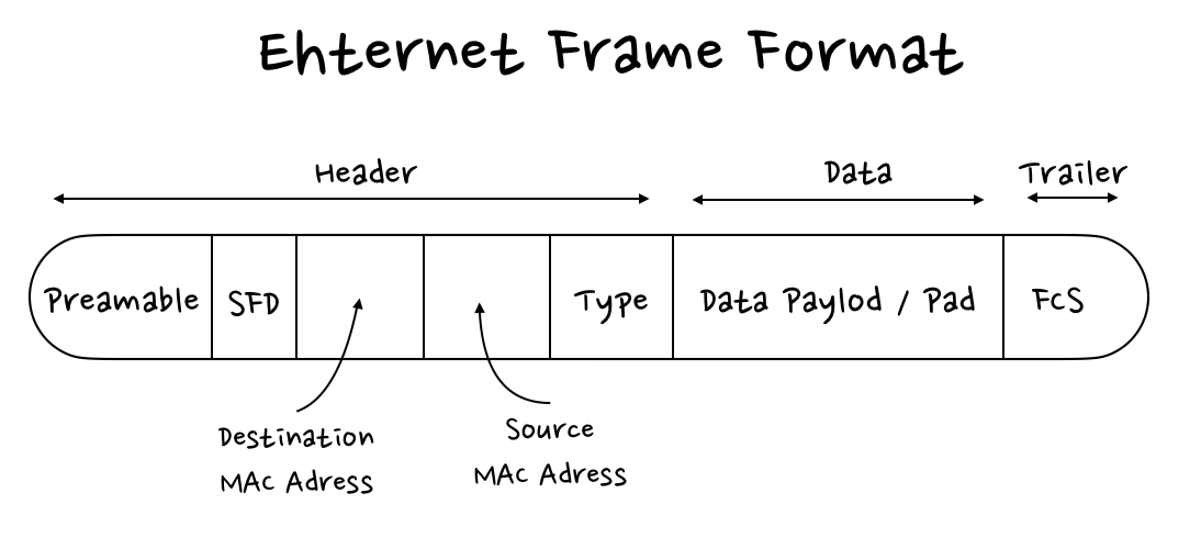 - 2계층 (데이터 링크 계층): 패킷에 이더넷 헤더와 트레일러를 붙여 프레임(Frame)이 됩니다.