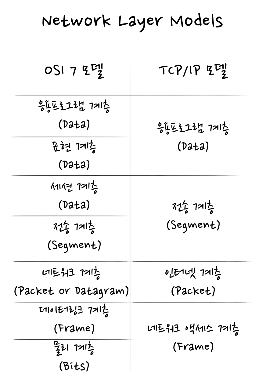 대표적인 네트워크 계층 모델로는 TCP/IP 모델과 OSI 7계층 모델이 있다. 번역에 따라 계층 이름이 다를 수 있음을 유의해야한다.