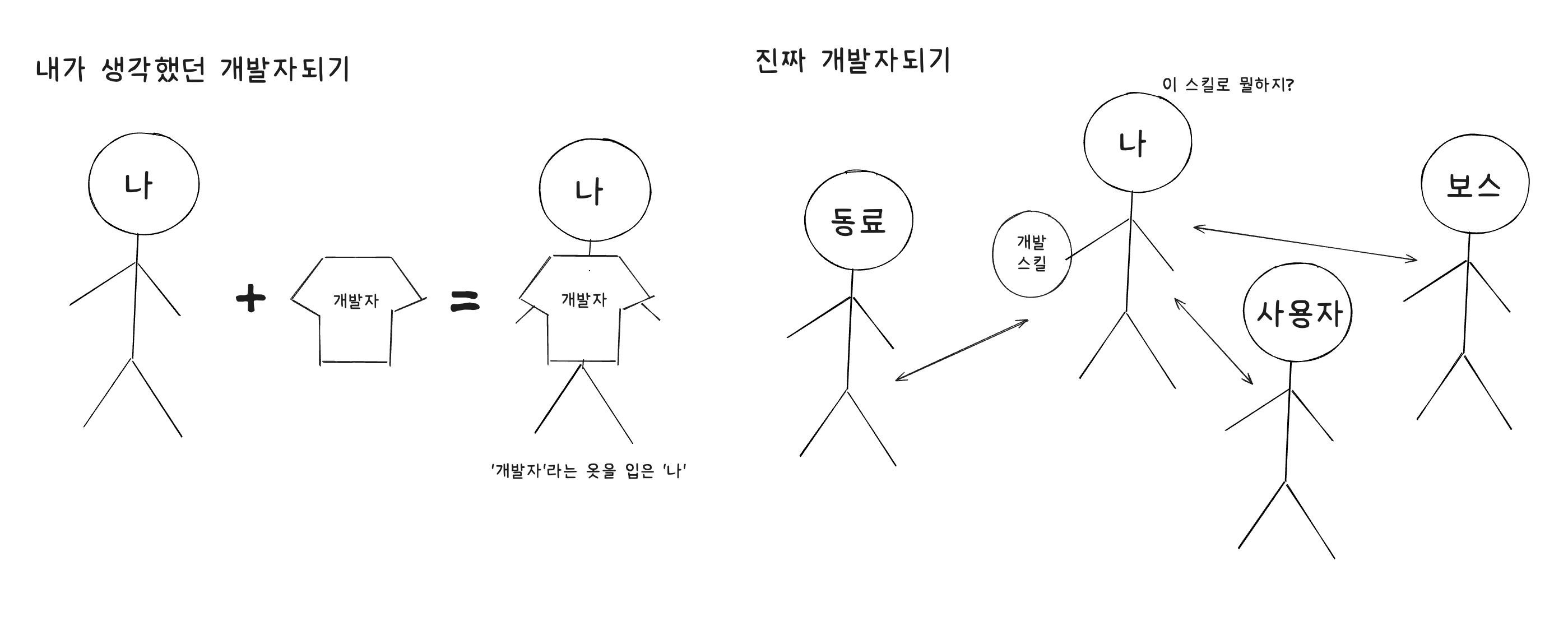 개발자가 된다는 것을, 그냥 '나'라는 사람이 '개발자'라는 옷을 입는 것으로 착각했다. 다른 사람에게 내가 어떤 개발자이고 싶은지를 더 고민해봐야 할 것 같다.